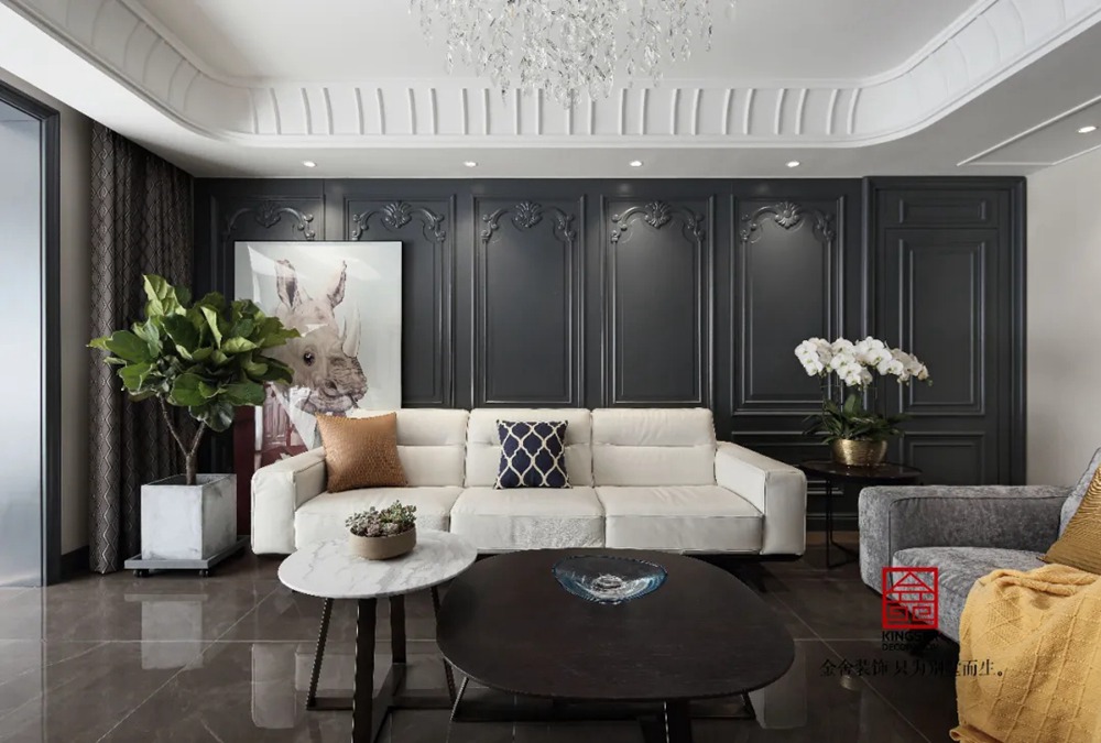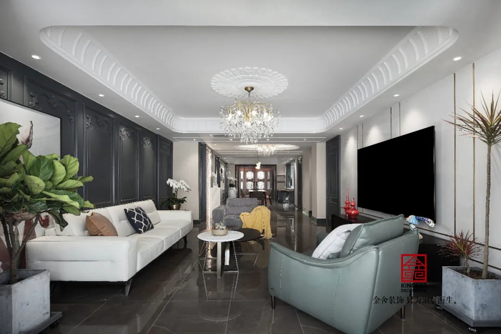 此案例為石家莊金舍裝飾-御河上院220平米新古典風格裝修實景。 新古典風格從簡單到繁雜、從整體到局部,精雕細琢、鑲花刻金都給人們留下一絲不茍的印象。它一方面保留了材質、色彩的精致風格,可以很強烈地感受到悠久的歷史痕跡與渾厚的文化底蘊,同時又摒棄了過于復雜的肌理和裝飾,簡化了線條。