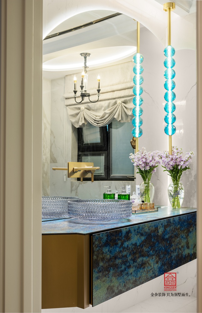 藍色多瑙河是這個空間的主調,不同純度,明度,亮度的藍色,讓空間高級浪漫,主衛打分最高,純純的法式浪漫情懷,淺海藍的透明浴缸,加之金屬銅色,奢華感十足。